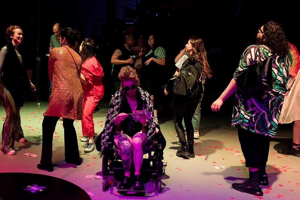 Een BECOMING-avond is geen doorsnee voorstelling. Het is wat de makers een ‘totaalervaring’ noemen, van binnenkomst tot afterparty. ‘Je zou het als een klein festival kunnen zien,’ zegt Loulou. ‘Bezoekers kunnen in de foyer buttons maken of langs het make-upstation om letterlijk hun transformatie naar de avond te starten. Daarna volgt een line-up van ongeveer acht uiteenlopende acts – een mix van onder andere poëzie, dans, spoken word en mini-workshops.’