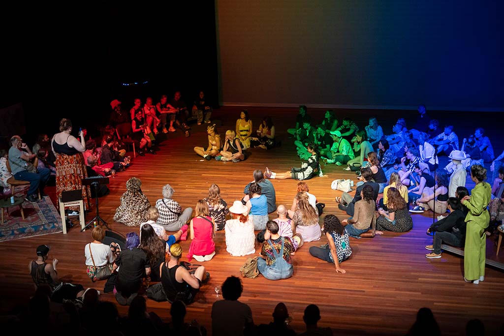 Loulou ziet theater als ‘hypermedium’: een interdisciplinaire plek voor beeldende kunst, dans en film. Daarbij vindt ze de verbinding met het publiek essentieel. ‘Het feit dat je samenkomt, zoals hier in een theaterruimte, is zo belangrijk in deze tijd. Traditioneel theater is vaak zo anoniem en individueel. Wij proberen juist echt met het publiek te versmelten, samen een transitie door te gaan – vandaar ook ‘becoming’. Ik noem dat ‘the art of gathering.’
