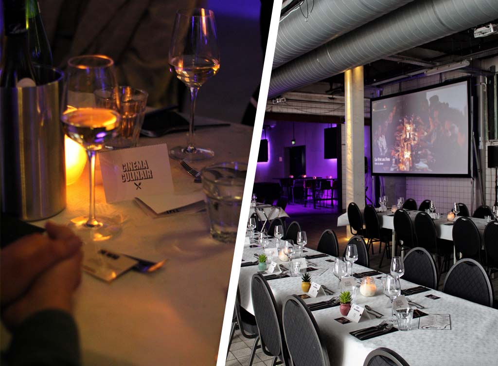 Met een tafelnummer in de ene hand en een glas in de andere zoeken mijn man en ik naar onze plekjes. De Wasruimte van de Werkspoorkathedraal is omgetoverd tot een sfeervol restaurant slash bioscoop met lange tafels. Bij binnenkomst hebben we een bakje popcorn gekregen en bij de bar de wijn besteld. Grote filmschermen hangen aan weerszijden van de tafels.