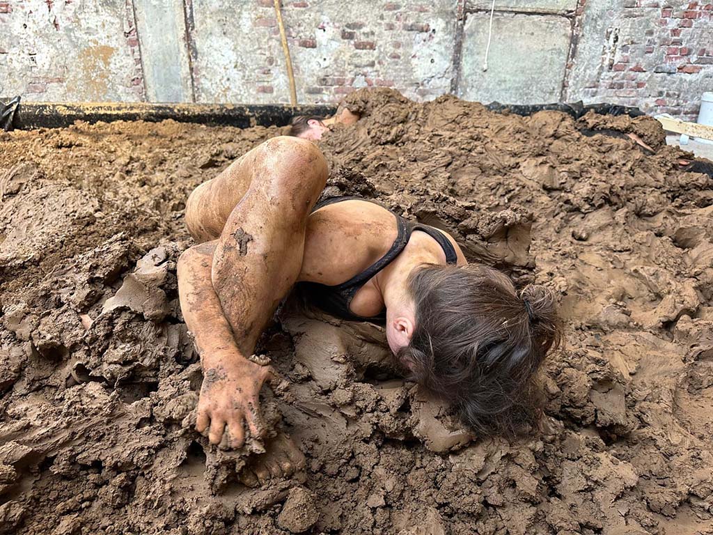 In haar nieuwste voorstelling laat Boukje Schweigman van theatergezelschap Schweigman& het lichaam terugkeren naar de basis. Het is een uitnodiging om te vertragen en te reflecteren op onze plek op aarde. Drie performers bewegen door een landschap van klei, leveren zich over aan het gewicht en gaan er een spel mee aan. ‘Het is een dwingend materiaal, vormeloos, log en traag, maar het omhullende ervan geeft ook een geborgen gevoel,’ vertelt Boukje. ‘En je kunt klei naar je hand zetten, zelf vormgeven. Aanvankelijk laten de spelers hun bewegingen bepalen door de zware klei, maar gaandeweg gaan ze ook de potentie ervan onderzoeken. Volgen en creëren: ik hou van die combinatie.’