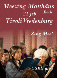 Op 21 februari 2026 organiseert het USKO de Meezing Matthäus in TivoliVredenburg! Honderden stemmen komen samen om de Matthäus-Passion van Bach uit te voeren. Overdag zing je met een gigantisch koor de stukken door. ’s Avonds volgt een magische uitvoering voor vrienden en familie.