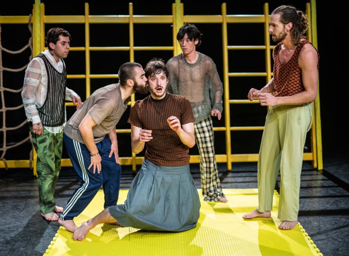 ‘It mainly features male dancers, a performer and the Utrecht rapper Tano Rivers. Tano recently wrote some lyrics about the pressure you’re sometimes under to act differently from how you actually feel. You see how five men behave towards each other in different situations revolving around touch and intimacy. How do they greet each other, for example? At what point does messing around and pushing each other begin to feel uncomfortable? The dancers are constantly checking with each other to see how to behave. When does touching become charged? How do you touch each other without feeling uncomfortable? It’s a serious subject, but the discomfort it generates can also be very funny.’